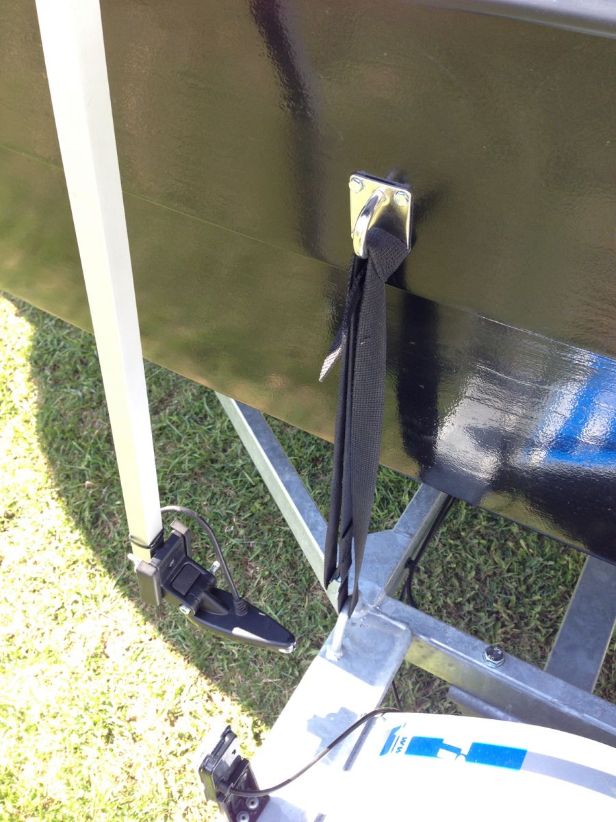 För att slippa dra spännband över båten när den ska sitta fast på trailern, så gjorde jag denna lösning. Riktigt smidigt att inte behöva dra spännband över båten.